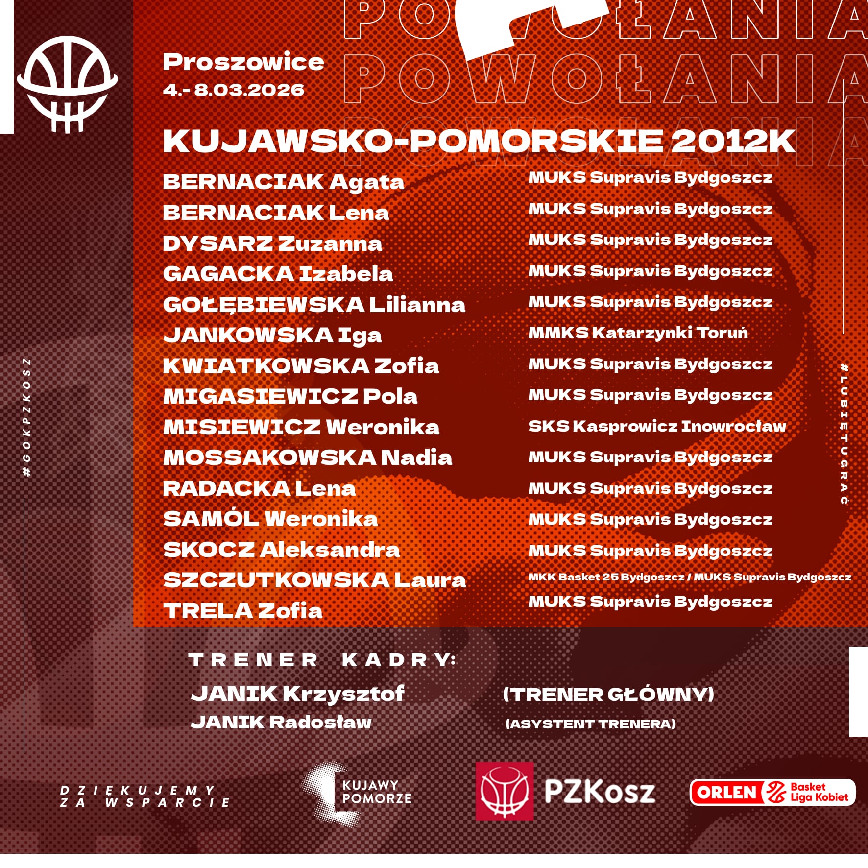 W dniach 4–8 marca 2026 roku w Hali Sportowej MOSiR w Proszowicach rozegrany zostanie turniej finałowy Ogólnopolskiej Olimpiady Młodzieży w koszykówce dziewcząt. Najlepsze reprezentacje wojewódzkie w Polsce powalczą o medale oraz utrzymanie w Dywizji A. W gronie ośmiu finalistów znalazła się również kadra Kujawsko-Pomorskiego rocznika 2012.